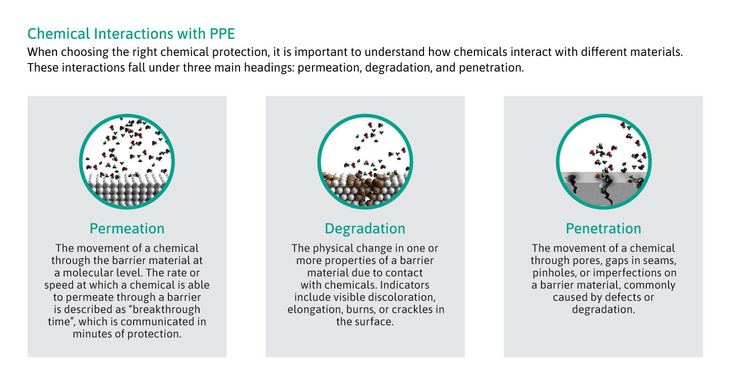 Standards such as EN ISO 374 and ASTM F739 have been put in place to assess the relative performance of materials against interactions such as permeation and degradation. A common way to compare protective properties of materials is through use of breakthrough times – the time taken for the chemical to permeate the material at rate defined within the standard.